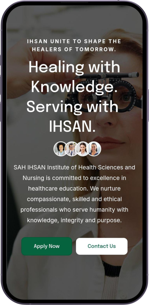 SAH IHSAN Institute of Health Sciences and Nursing is committed to excellence in healthcare education. We nurture compassionate, skilled and ethical professionals who serve humanity with knowledge, integrity and purpose.